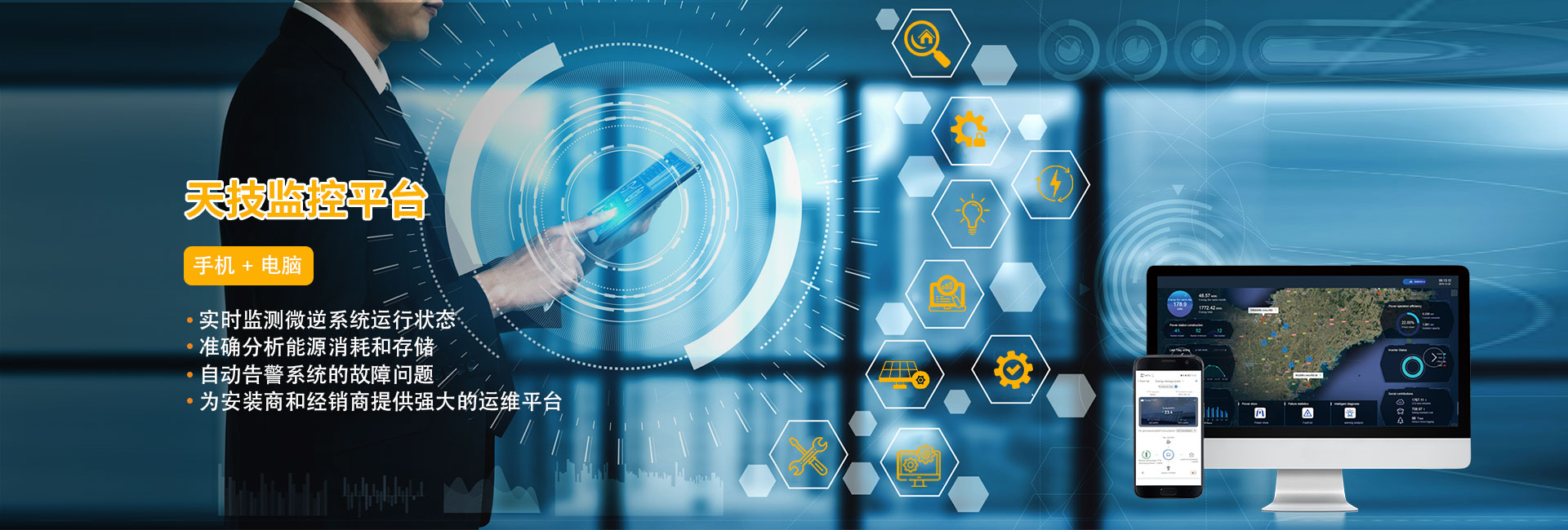 天技 T-Shine Cloud 云监控平台是天技最新的微逆系统云监测云管理平台。通过T-Shine Cloud 的客户端,用户可以轻松查看每一个电站的详细发电情况。可以实时监测微逆系统每天的发电量,用电量,减少的而碳排放和产生的效益。通过对每天,每月,每年以及累计的系统发电以及能量消耗数据进行可视化对比分析,可以生成准确详细的系统报告,让用户轻松掌控微逆系统的运行状况,可以及时调整系统容量,轻松扩容。T-Shine Cloud 应用组件级监控,能监测到用户微逆系统的每一块组件的发电效益和运行状态,如果系统运行出现故障,将会立刻主动告警,帮助用户即时调整排除故障。